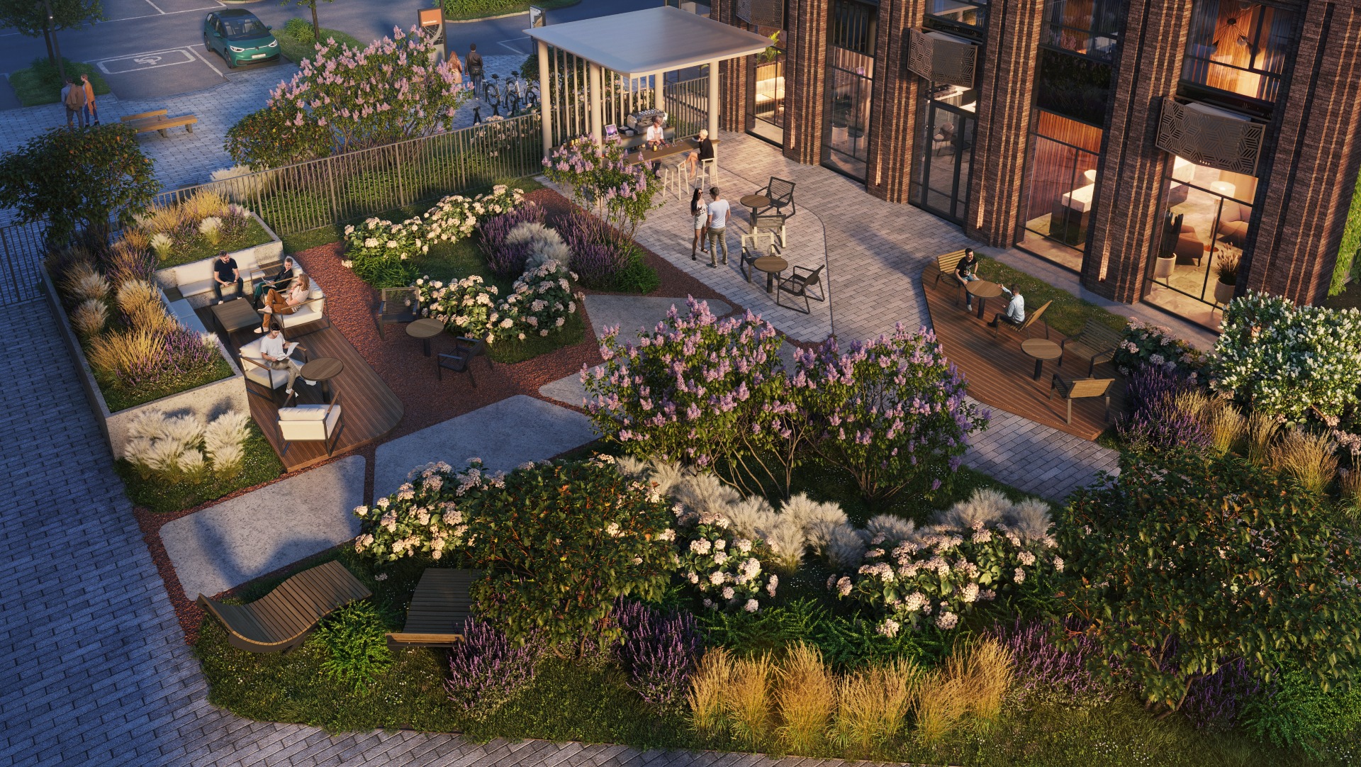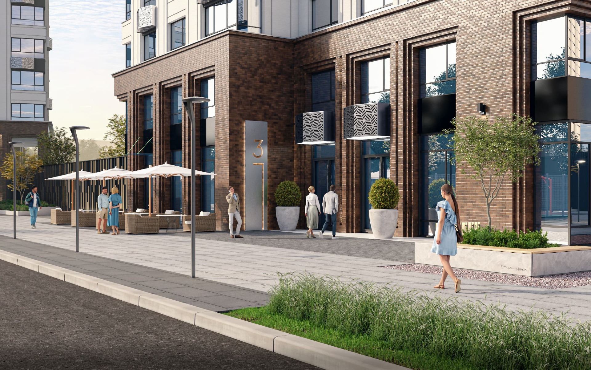 Парадный вестибюль с камином и кафе, двор с лаунж-зонами, фонтаном, сенсорным садом, детскими и спортивными площадками внутри.