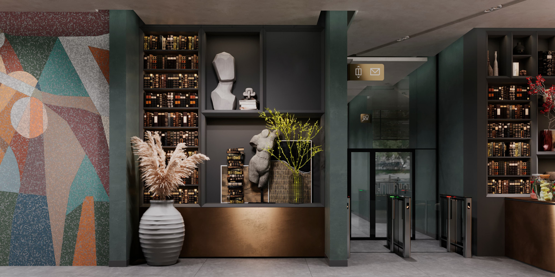 Интерьер вестибюля с кофейней, камином и панорамными видами выполнен в благородных приглушенных тонах с авторским панно из мозаики.