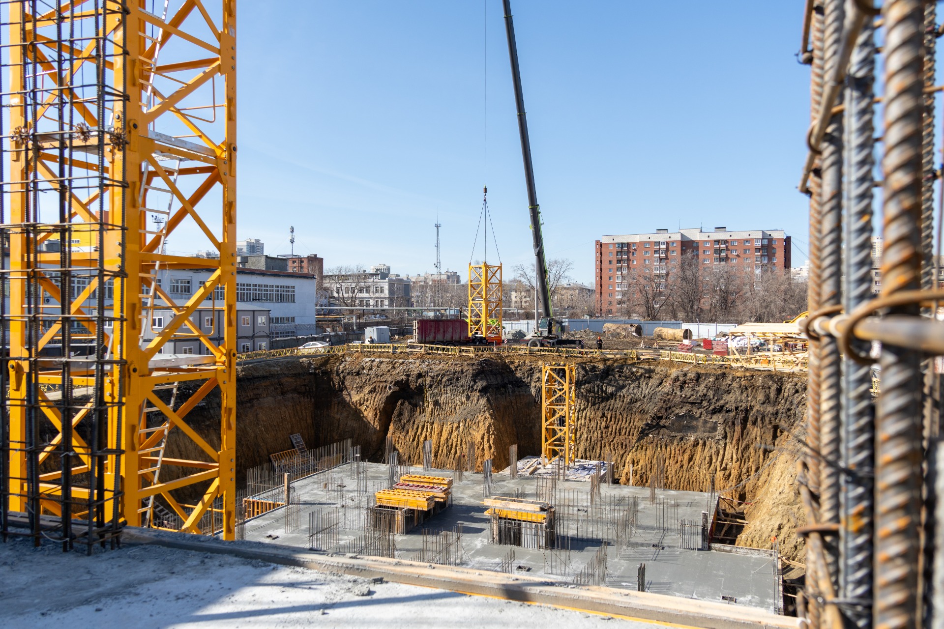 Строительство нашего квартала Лето на Титова уверенно продвигается вперед. В первой очереди строительства часть работ уже выполнена: на 30% закончено устройство шпунтового ограждения, полностью готов котлован 4-го дома и завершено устройство искусственного основания. Армирование фундаментной плиты выполнено на 60%, а фундамент башенного крана для 4-го дома готов на 100%. Также приступили к выносу сетей, этот этап завершен на 30%.